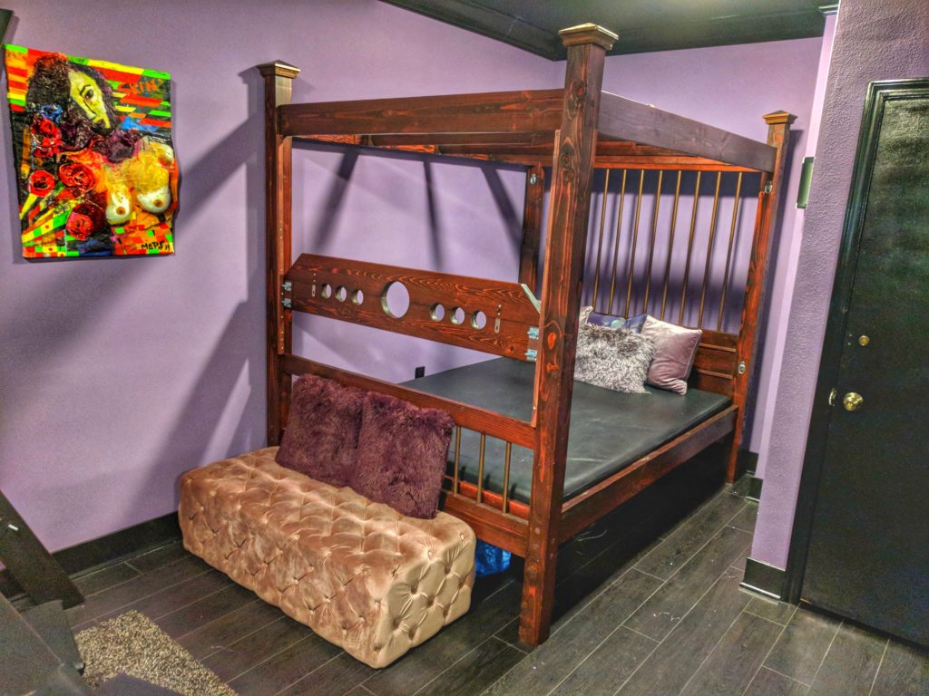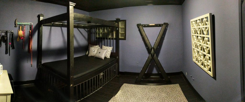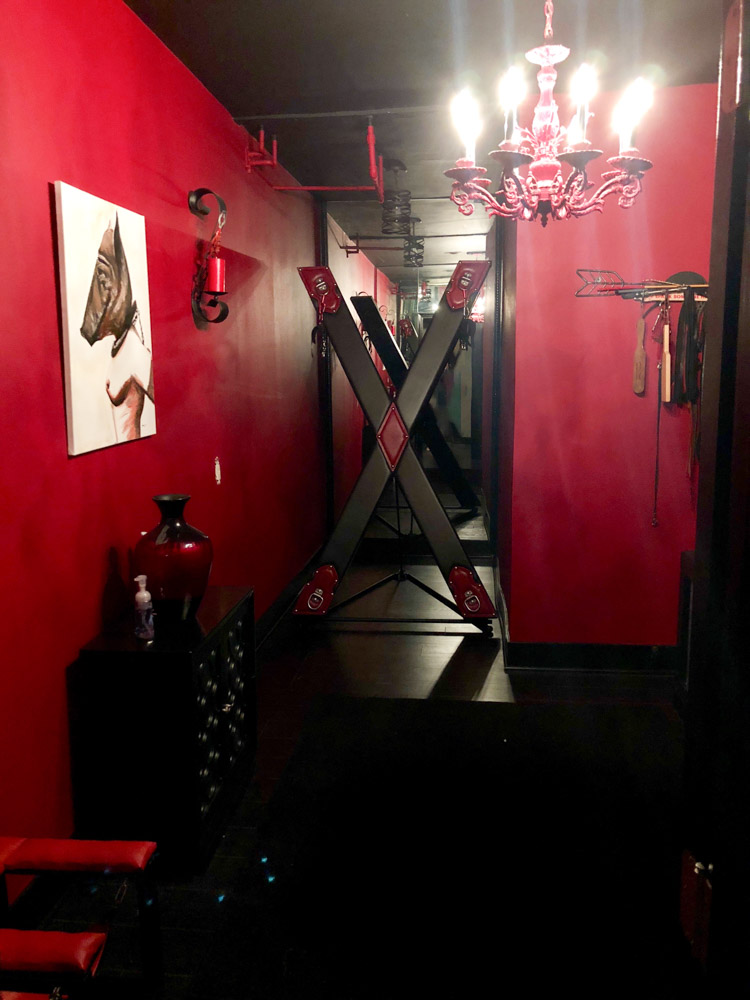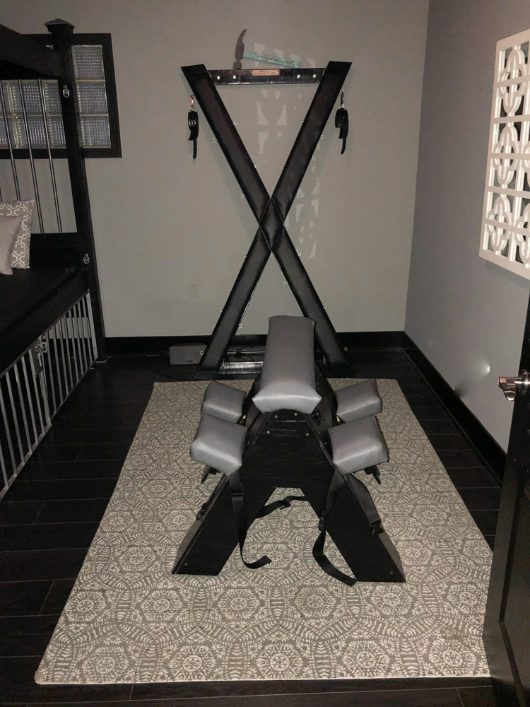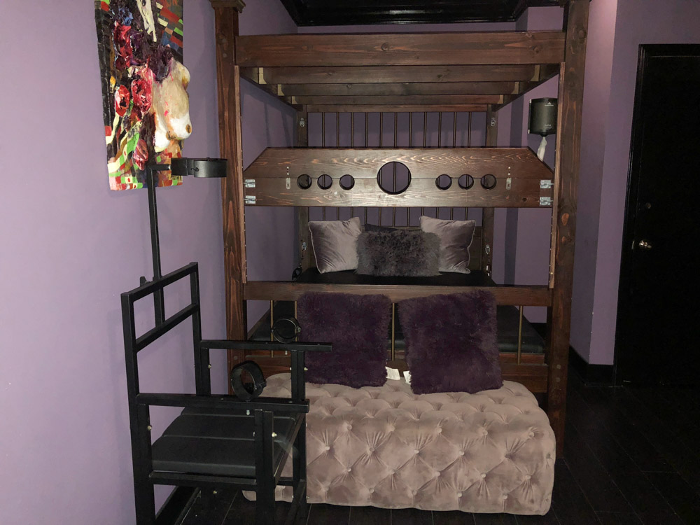 Purple Room Grey Room Red Room Grey RoomPurple Room StocksRed Room CrossPurple Room Bondage BedSt Andrew’s CrossSling and Spanking Bench